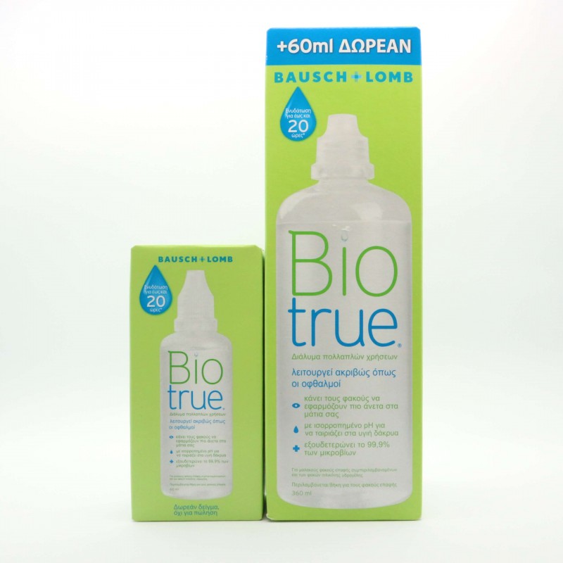 Διάλυμα πολλαπλών χρήσεων, για απολύμανση & ενυδάτωση, το οποίο λειτουργεί ακριβώς όπως οι οφθαλμοί και κάνει τους φακούς να εφαρμόζουν πιο άνετα στα μάτια σας. Υγρό φακών επαφής Biotrue της Bausch & Lomb, το οποίο είναι σχεδιασμένο για να λειτουργεί όπως τα μάτια σας. Μελετώντας με ποιο τρόπο το μάτι λειτουργεί φυσικά για να καθαρίζεται, ενυδατώνεται και να διατηρείται υγιές, η Bausch + Lomb ανέπτυξε μια μοναδική και καινοτόμο λύση για να παρέχει εξαιρετική φροντίδα στους φακούς επαφής. Το Biotrue ξεπερνά και την πιο εξαιρετική απολύμανση με το να συνδυάζει τρεις βιο-εμπνευσμένες καινοτομίες, έχει ένα λιπαντικό που συναντάται φυσιολογικά στα μάτια σας, έχει pH ίδιο με των υγιών δακρύων και διατηρεί ορισμένες ευεργετικές πρωτεΐνες ενεργές.